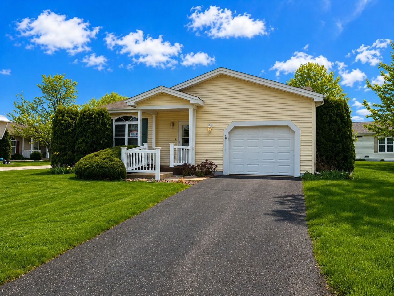 Absolutely beautiful and move-in ready, this well-maintained 2-bedroom, 2-bath home is perfectly situated on an oversized corner lot in the desirable Saddlebrook Farms 55+ community. The open-concept layout features bright, spacious living and dining areas with soaring 9-foot ceilings and elegant crown molding, flowing seamlessly into a nicely sized kitchen with a large breakfast bar and abundant cabinetry. The expansive primary suite offers a private bath and walk-in closet, while the sun-drenched second bedroom, complete with double-door entry, is ideal for a home office, den, or guest space. Enjoy ample storage throughout, plus an oversized one-car garage with shelving and attic access. Relax on the maintenance-free front porch or rear deck, surrounded by mature, low-maintenance perennial landscaping. Saddlebrook Farms offers a vibrant, independent lifestyle with five miles of walking and biking paths, stocked fishing ponds, vegetable garden plots, a state-of-the-art fitness center with daily classes, and a community lodge hosting year-round activities, a library, game room, picnic grove, bocce ball courts, horseshoe pits, and more. Nothing to do but move in and start enjoying everything this exceptional home and community have to offer-come see it before it's gone!